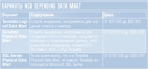 ПО NCR Depending Data Mart предлагается в трех вариантах. Первый, наиболее дешевый, предназначен для компаний, которые хотели бы внедрить киоск данных на той же базе данных и том же сервере, которые содержат хранилище данных. Он называется Teradata Logical Data Mart и стоит от $37 000 до $82 000.