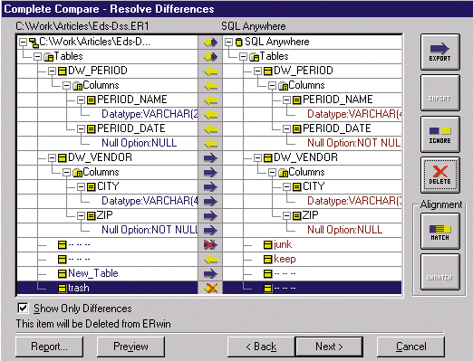 Кроме того, утилита Complete Compare в ERwin способна быстро синхронизовать модели, сценарии и базы, что чрезвычайно важно для управления выполнением проектов. Например, в окне Complete Compare Resolve Differences показываются расхождения и их детализация между моделью и тестовой базой SQL Anywhere - этого не предоставляет никакое другое средство моделирования баз данных.