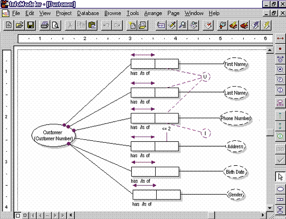 Главные достоинства InfoModeler - пользовательский интерфейс и поддержка как новейшей технологии объектного ролевого моделирования (ORM, object role modeling), так и традиционного моделирования сущность-связь (ERM, entity relationship modeling). Пользовательский интерфейс производит хорошее впечатление. Меню и панели инструментов толково организованы и с пониманием дела классифицированы. Единственные замеченные недостатки интерфейса - неполнота диалоговой справочной системы и невозможность редактирования непосредственно на экране - для внесения изменений нам приходилось использовать диалоговые окна.