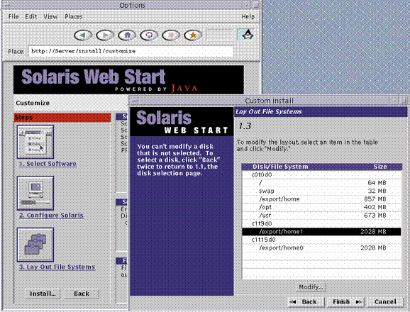 Хотя новая версия Solaris позволяет проводить инсталляцию и работать с документами посредством собственного Web-браузера (см. рисунок), нам то и дело приходилось прибегать к текстовым приглашениям и длинным командам Unix, выполняя задачи, для которых графические интерфейсы не предусмотрены.