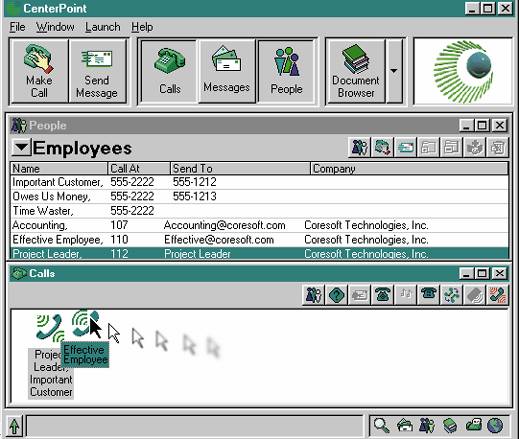 CenterPoint 2.0 имеет панель инструментов, с помощью которой пользователь может производить настройку интерфейса. Используемый в Windows стандартный метод транспортировки объектов позволяет подключать какого-либо человека к дискуссии простым совмещением его имени с именем другого участника конференции. Более того, если перенести документ на пиктограмму вызова абонента, то документ будет автоматически передан этому абоненту по факсу или E-mail. Можно также производить рассылку сообщения сразу по многим адресам. Для этого имя файла нужно совместить с соответствующей пиктограммой группы пользователей.
