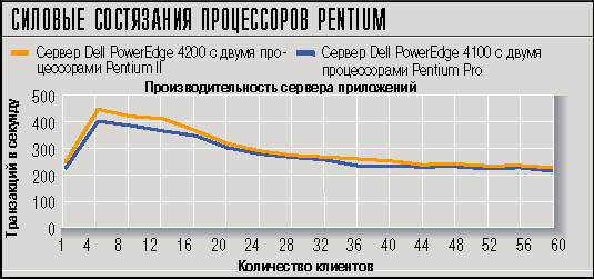 Максимальная производительность 300 МГц процессоров Pentium II оказалась лишь на 9 % выше производительности Pentium Pro при их использовании в сервере приложений. В испытаниях применялась тестовая программа Ziff-Davis Benchnark Operation’s ServerBench 4.0. Оба сервера были оснащены шестью жесткими дисками, объединеными в дисковой массив RAID 0, и оперативной памятью 256 Мб.