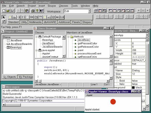 В этом пакете стоимостью менее $500, поставки которого начались в середине сентября, Symantec удалось связать воедино компонентную модель JavaBeans и интерфейсы прикладного программирования Java 1.1. В результате получился продукт, не уступающий по своим качествам инструментам разработки второго поколения, таким, как JBuilder фирмы Borland International и VisualAge for Java корпорации IBM.