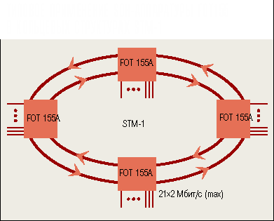 Новый мультиплексор SDH STM-1 французской фирмы SAT модели FOT-155 стоит менее $14 000 в конфигурации 21 поток Е1, $16 000 для 42 потоков Е1 и $18 000 для 63 Е1, т. е. от $285 до $760 за порт - дешевле, чем PDH! Возможности же нового мультиплексора превосходят возможности предыдущего поколения оптических систем передачи. FOT155 может эффективно использоваться для соединений “точка - точка”, в том числе в конфигурациях с регенератором (для расстояний свыше 100 км). При необходимости часть потоков может быть ответвлена в третьей точке. В соответствии со стандартом SDH, FOT155 благодаря структуре кадра может использоваться в качестве электрического или оптического мультиплексора при подключении к системам SDH более высокого порядка, например SAT FOT2400. Наличие резервного оптического приемопередатчика позволяет применять FOT155 в конфигурациях со стопроцентным резервированием и в кольцевых структурах, показанных на рисунке.
