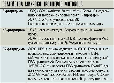 В преддверии эры портативной электроники важной стороной деятельности Motorola является активизация борьбы за снижение энергопотребления. Эта тема стала лейтмотивом всех сообщений, каких бы компонентов они ни касались - от операционных усилителей до процессоров. Интерес аудитории вызвала также новая группа компонентов, поддерживающих программируемую логику (Field Programmable Gate Array - FPGA). Если же говорить непосредственно о микроконтроллерах (МК), то их основные особенности практически совпадают с особенностями компонентов Motorola в целом: широчайший ассортимент, высокое качество и глобальная поддержка. И, как следствие, устойчивое первое место в мире по объему продаж.