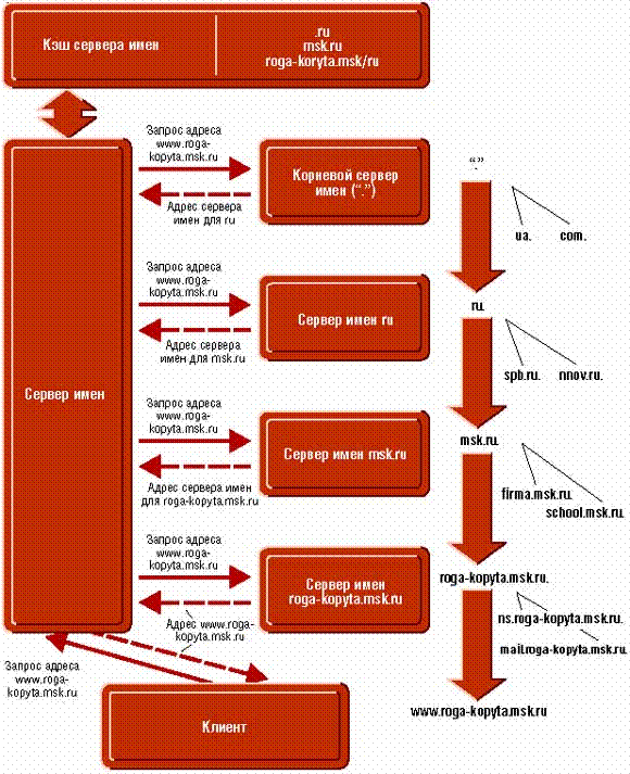 Основная цель сетевой службы DNS, как уже было сказано, - поставить в соответствие символьному адресу компьютера (т. е доменному имени) его IP-адрес. Доменное имя компьютера состоит из двух частей: имя компьютера и домен, в котором оно находится. Например, компьютер www.roga-kopyta.msk.ru имеет имя www и находится в домене roga-kopyta.msk.ru. Точно так же домен roga-kopyta.msk.ru раскладывается дальше.