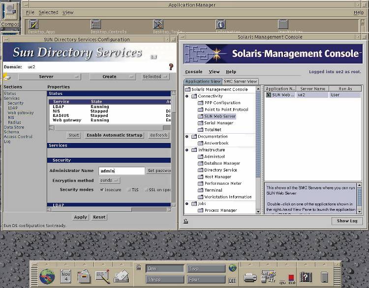 Наконец, новая консоль администрирования Solaris позволяет все операции выполнять с одного рабочего места. С ее помощью мы создавали в ходе тестирования регистрационные записи пользователей, управляли устройствами хранения данных и запускали работающие через Web утилиты администрирования. При добавлении в систему новых приложений на консоли автоматически появлялись пиктограммы для них.