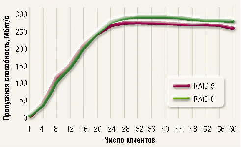 При проведении эталонного теста NetBench 6.0 фирмы Ziff - Davis Media, предназначенного для измерения производительности файловых серверов, максимальная пропускная способность N2400 в конфигурации RAID 0 составила 281 Мбит/с, а в конфигурации RAID 5 - 266 Мбит/с (см. график). По этим показателям система Compaq превосходит все другие устройства для сетей хранения, когда-либо проходившие тестирование в eWeek Labs. Ее производительность даже выше, чем у NetForce фирмы Procom Technology.