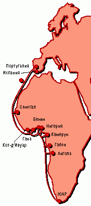 По сообщениям информационных агентств, запущена в эксплуатацию подводная кабельная сеть SAT-3/WASC DWDM протяженностью 14 тыс. км. Проект, включающий создание наземных и подводных линий связи на основе оборудования и технических решений компании Alcatel (www.alcatel.com), был реализован точно в срок. Сеть SAT-3/WASC протянулась от Португалии до южной оконечности ЮАР. Она обеспечивает высокоскоростную связь между Европой и рядом стран, расположенных вдоль западного побережья Африки.