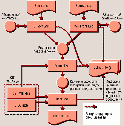 - BackEnd (общий настраиваемый генератор оптимизированного кода).