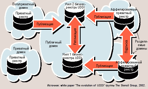 В то время как версия UDDI 2.0 предназначалась для поддержки каталогов электронного бизнеса, версия 3.0 ориентирована и на внутрикорпоративное использование - для построения корпоративных систем в рамках идеологии Service Oriented Architecture. Поэтому она допускает создание реестров нескольких типов (общедоступный, частный и с разделяемым доступом).