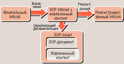 Задает альтернативный общепринятому способ сериализации XML Infoset. Полезен, когда внутри SOAP-сообщений передается мультимедийный и прочий двоичный контент. В обычной форме этот контент должен быть закодирован в виде base64 и помещен в тело SOAP. При помощи XOP его можно вынести в последовательность MIME-блоков, находящихся за пределами конверта SOAP-документа. В теле же документа остаются лишь ссылки на эти данные.
