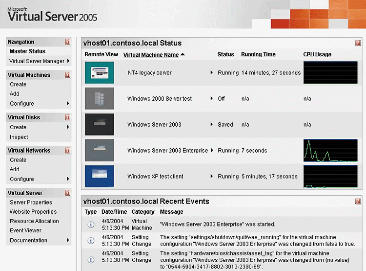 Администрирование MVS выполняется с помощью стандартных серверных инструментов управления, а также специализированной MVS-консоли с Web-интерфейсом - Virtual Server Administration Website (рис. 2). Программный набор COM API (42 программных интерфейса и несколько сот функций) позволяет создавать различные сценарии для автоматического развертывания и конфигурирования подключенных ВМ.