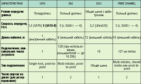 Как видно из таблицы, разработчики спецификации SAS постарались при разработке спецификации нового интерфейса применять механизмы, используемые в SATA и Fibre Channel, но в то же время обеспечить полную совместимость с набором команд параллельного SCSI, что должно максимально упростить переход на последовательный SCSI. Однако самое интересное новшество спецификации SAS - это заложенная в нее совместимость с коннекторами и кабелями SATA, что дает возможность устанавливать в одну дисковую полку накопители, использующие оба последовательных интерфейса. Диски SAS относятся к классу Enterprise, т. е. имеют более высокое по сравнению с SATA-дисками быстродействие и большую наработку на отказ, однако уступают им по емкости, к тому же они существенно дороже. Комбинирование обоих типов дисков позволяет в пределах одной полки или сервера построить экономичную двухуровневую систему хранения - на дорогих SAS-дисках хранятся важные данные, к которым происходит частое обращение, а остальные файлы (например, архивы и резервные копии) записываются на дешевые винчестеры SATA большой емкости. (До сих пор такое смешение дисков разных типов было реализовано только в дисковом массиве StorageWorks EVA компании HP, построенном на основе технологии Fibre Channel. В этой системе наряду с обычными накопителями Fibre Channel используются специальные диски FATA, которые представляют собой ATA-диски, снабженные интерфейсом Fibre Channel.) К настоящему времени все производители SCSI-дисков уже анонсировали модели с интерфейсом SAS, и ожидается, что в I квартале следующего года начнется массовое производство систем, использующих эти накопители.