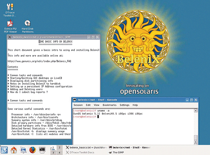 Мы проверили в работе версию Belenix 0.5 LiveCD, установив ее на виртуальную машину VMware с ОЗУ емкостью 1 Гб. Во время загрузки система предложила нам на выбор две среды настольных систем: Xfce и KDE (K Desktop Environment). Вторая из них в реализации Belenix мало чем отличается от стандартного KDE, поэтому будет хорошо знакома всем, кто уже имел дело с этим интерфейсом. Дистрибутив укомплектован широким спектром приложений для настольных систем и содержит удобные ссылки на множество ресурсов для начинающих пользователей, среди которых есть и руководство по модулю DTrace из состава Solaris.