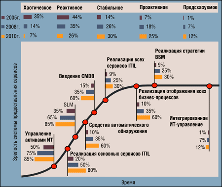 Стратегия BSM, анонсированная BMC в 2003 г., завоевывает все большую популярность. Для иллюстрации можно привести прогноз готовности предприятий с оборотом более 1 млрд. долл. к внедрению тех или иных ее элементов, который приведен на так называемой S-кривой Forrester (рис. 1). Здесь на кривую, иллюстрирующую постепенное прохождение предприятием через этапы развития средств управления ИТ-инфраструктурой от хаотичного состояния до полностью предсказуемого, нанесены данные о том, какая часть крупных предприятий будет иметь на вооружении основные технологии BSM вплоть до 2010 г.