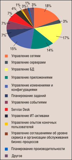| ИТ-управление в цифрах Растущий интерес к ПО для управления бизнес-процессами, базирующимися на ИТ, предсказывают и аналитические агентства. Так, по прогнозам Forrester Research, опубликованным в марте, мировой рынок ПО для ИТ-управления за текущий год вырастет по сравнению с прошлым на 12% и достигнет 15,7 млрд. долл. (в 2006-м объем рынка составлял 14,0, а в 2005-м - 13,0 млрд. долл.). При этом наибольшие темпы роста продаж ожидаются для ПО управления изменениями и конфигурациями (28%), управления ИТ-активами (26%), а также управления соглашениями об уровне сервиса и организации обслуживания бизнес-процессов (SLM/BSM - 23%). Другие типы ПО ИТ-менеджемента тоже будут расти, но более скромными темпами. Общая структура рынка ПО для ИТ-управления на 2006-й представлена на рис. 2.