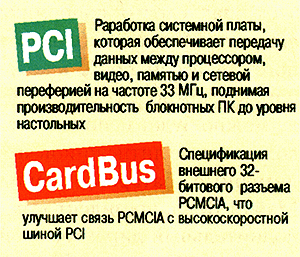 Хотя сочетание РСI и CardBus обещает обеспечить высокую производительность блокнотных ПК, затягивание дела в бюрократических недрах комитета PCMCIA и РСI SIG (Special Interest Group) заставляет поставщиков сомневаться, что они смогут выпустить системы на базе PCI и CardBus в этом году.