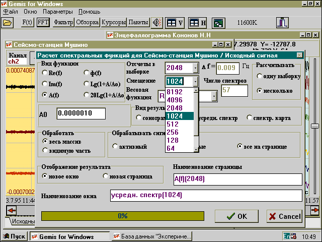 - выполнение анализа сигналов во временной и частотной областях. Базовый комплект GeMiS обеспечивает реализацию стандартных процедур цифровой обработки сигналов (интегрирование, дифференцирование, сглаживание, автокорреляционные и спектральные функции и др.). При расчете спектральных и корреляционных функций расчет ведется с использованием быстрого преобразования Фурье (предельная длина выборки 8192 отсчета) с применением разнообразных "оконных" функций. Если в анализируемом сигнале более 8192 отсчетов, то результат может быть получен как усреднение по спектрам (или корреляционным функциям), рассчитанным по выборкам заданной длины из исходного сигнала (интервал между выборками также может быть задан). Расширенная версия программы обеспечивает пользователю возможность подключить к GeMiS свои собственные функции обработки (программа должна быть представлена в виде ехе-файла, обмен данными с GeMiS выполняется через промежуточные временные файлы), что делает GeMiS программой, пригодной для использования в любой области, где требуется отображение и обработка массивов отсчетов;