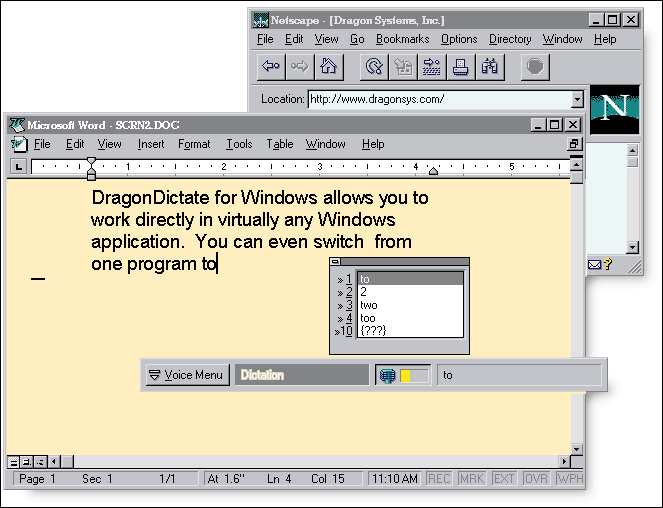 IBM выпустила ПО VoiceType 3.0 для Windows 95, работающее непосредственно внутри стандартных приложений, а Dragon выпустила DragonDictate 2.5, которое также работает со стандартными приложениями и предназначено для Windows NT и использования в intranet.