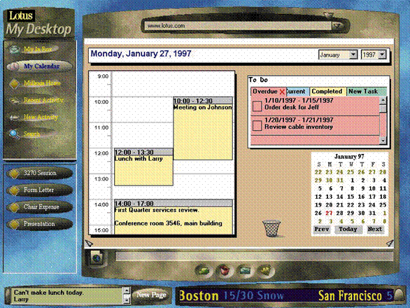 По словам Кэри Александр, главного менеджера по вопросам NC Desktop в корпорации Lotus (Кеймбридж, шт. Массачусетс), этот ГИП (графический интерфейс пользователя) будет включать набор функций, похожий на таковой в Internet Explorer корпорации Microsoft и в браузере Navigator корпорации Netscape Communications, однако рассчитан он исключительно на СК. Среди функций - просмотр Web, управление файлами, электронная почта, доступ к корпоративным данным и функциям личной информационной системы (ЛИС). Для его установки требуется 1Мб памяти.