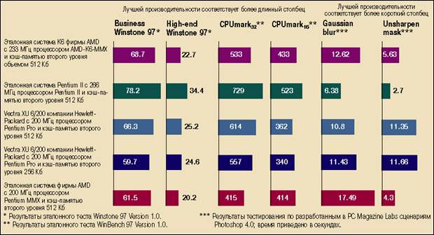 Система с Pentium II по производительности существенно превзошла как компьютер с К6, так и Vectra XU 6/200 компании Hewlett-Packard. Последний мы поочередно оснащали двумя разновидностями 200 МГц процессора Pentium Pro с различным объемом кэш-памяти - 512 Кб и 256 Кб.