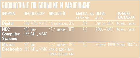 Корпорация Digital Equipment (Мейнард, шт. Массачусетс), подразделение компьютерных систем фирмы NEC (Маунтин-Вью, шт. Калифорния) и компания Micron Electronics (Нампа, шт. Айдахо) готовят к выпуску в начале лета новые тонкие ПК-блокноты.