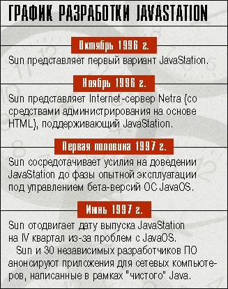 Хотя JavaStation была анонсирована Sun еще в октябре прошлого года, коммерческое распространение этой машины задержалось из-за проблем с ОС JavaOS. Теперь перед Sun стоит задача выпуска JavaStation второго поколения, намеченного на середину 1998 г., но с ее решением может произойти то же самое, поскольку реализация значительной части необходимых функций отдана на откуп сторонним организациям.