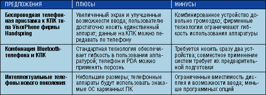 Нельзя сказать, чтобы производители не стремились создать интегрированные системы. Но уже много говорилось о крошечных экранах сотовых телефонов, малопригодных для работы с данными или управления персональной информацией, и о попытках фирмы Qualcomm соединить устройство на основе Palm OS с беспроводной телефонной трубкой, приведших к появлению неуклюжего и всеми ругаемого аппарата pdQ Smartphone.