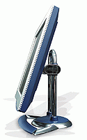 Дизайнеры потрудились на славу: оригинальная ретроподставка в стиле 30-х годов прошлого столетия, использующая U-образную хромированную трубу в роли несущей конструкции, гармонично сочетается со вполне современным обрамлением ЖК-панели, отделанной синей и серебристой пластмассой. Аппарат равно эффектно выглядит со всех сторон. Подставка позволяет поворачивать панель и наклонять, но не допускает регулировку высоты над столом. Монитор питается от внешнего сетевого адаптера.