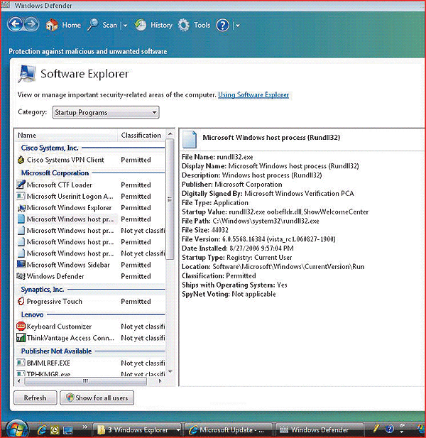 Самые заметные последствия обновления проявились в интерфейсе Software Explorer приложения Windows Defender, предназначенного для борьбы со шпионскими программами. Выведенный здесь список автоматически запускаемых вместе с ОС программ оказался переполненным файлами из образа Windows XP, причем далеко не все из них признавались легитимными. Подозрительными, скажем, приложению показались четыре разных хост-процесса Windows, происхождение которых мы с ходу определить не смогли.