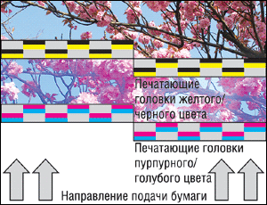 В принтерах с технологией Edgeline бумага перемещается под печатающими головками. На рис. 3 схематично показана возможная конфигурация четырехцветной печатающей головки (CMYK) для носителя формата A4. Две печатающие головки проходят по странице, при этом каждая печатает двумя цветами. Вместе четыре такие головки имеют 42 240 сопел.